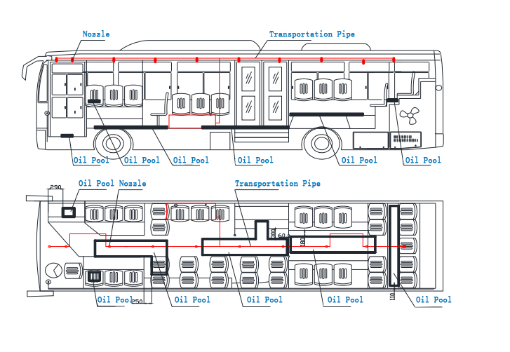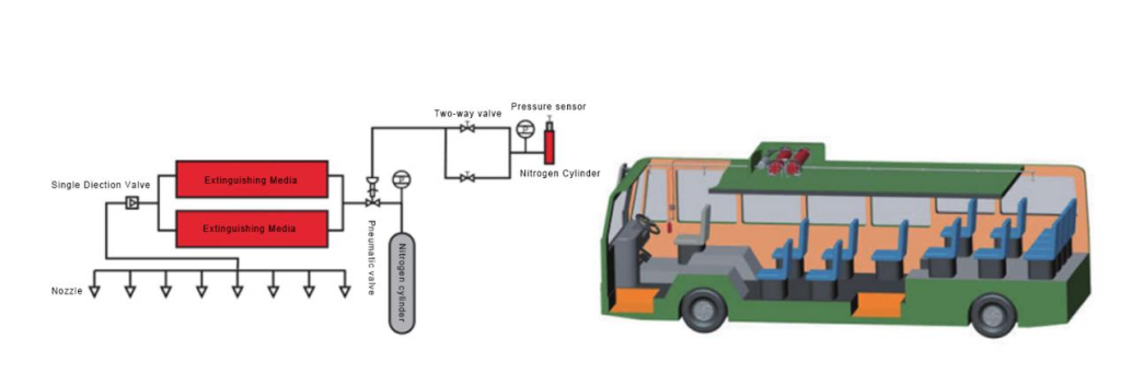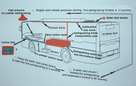 There are pump supplied and cylinder supplied system for bus fire extinguishing system. The first developed system was pump supplied system. The engine room adopted dry powder extinguishing media.