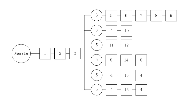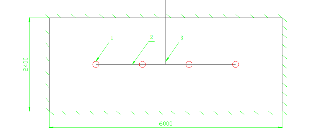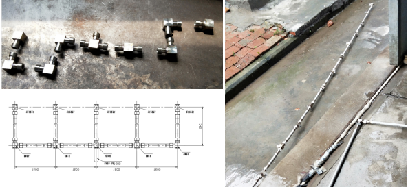 Testing area 2.4 m×6.0 m with arrangement as below figure. The distance from the highest water outlet of the water mist nozzle to the upper edge of the water collecting box is 2.1m, and 4 identical nozzles are symmetrically arranged on the test pipe network. Nozzle spacing is 1.2 m.