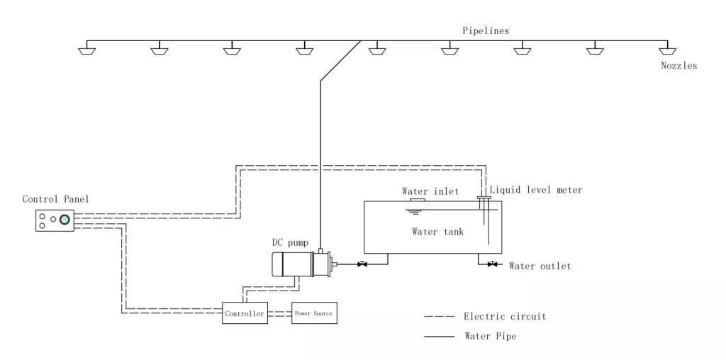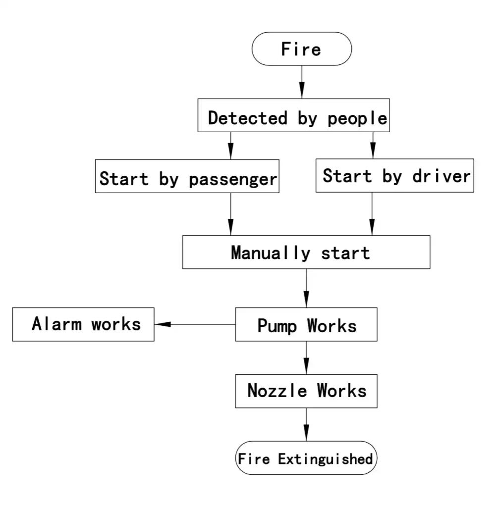 In the event of a fire, the driver or passenger manually activates the system, and the fire extinguishing agent stored in the water tank is sprayed to the passenger cabin through the DC water pump, pipeline and nozzle to extinguish the fire. At the same time, after the water pump starts, the buzzer on the control panel will give an alarm, warning passengers and surrounding people to evacuate from the fire scene. After the fire is extinguished, the water pump can be turned off manually, or the liquid level switch can be linked to turn off the water pump after the agent is sprayed (the working principle of the system is shown in Figure 2).